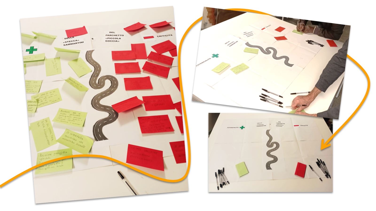 Su un cartellone diviso in due da una strada disegnata con scritto "stecca Sammartini e Parchetto Piccola Goccia", le persone sono invitate a scrivere su un post-it rosso le criticità e su un post-it verde le potenzialità di questi spazi, attaccandoli rispettivamente a sinistra o a destra della strada.