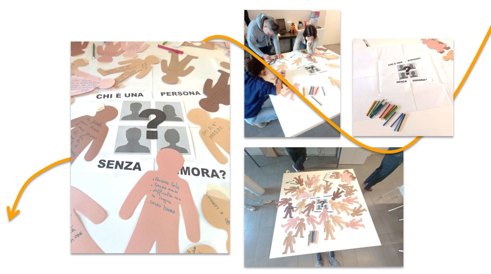 Un cartellone con al centro un profilo di una persona con un punto di domanda. Le persone scrivono una risposta alla domanda "chi è una persona senza dimora?" su una sagoma di carta a forma di persona stilizzata e la attaccano al cartellone.