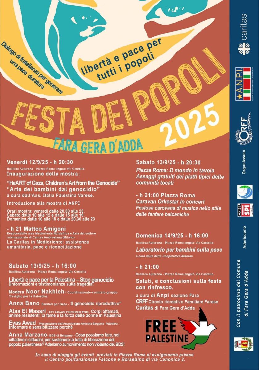 “Festa dei popoli 2025”, tradizionale fine settimana di approfondimento organizzato a Fara Gera d’Adda, sotto il patrocinio dell’Amministrazione comunale, da Caritas, Anpi e Rff.