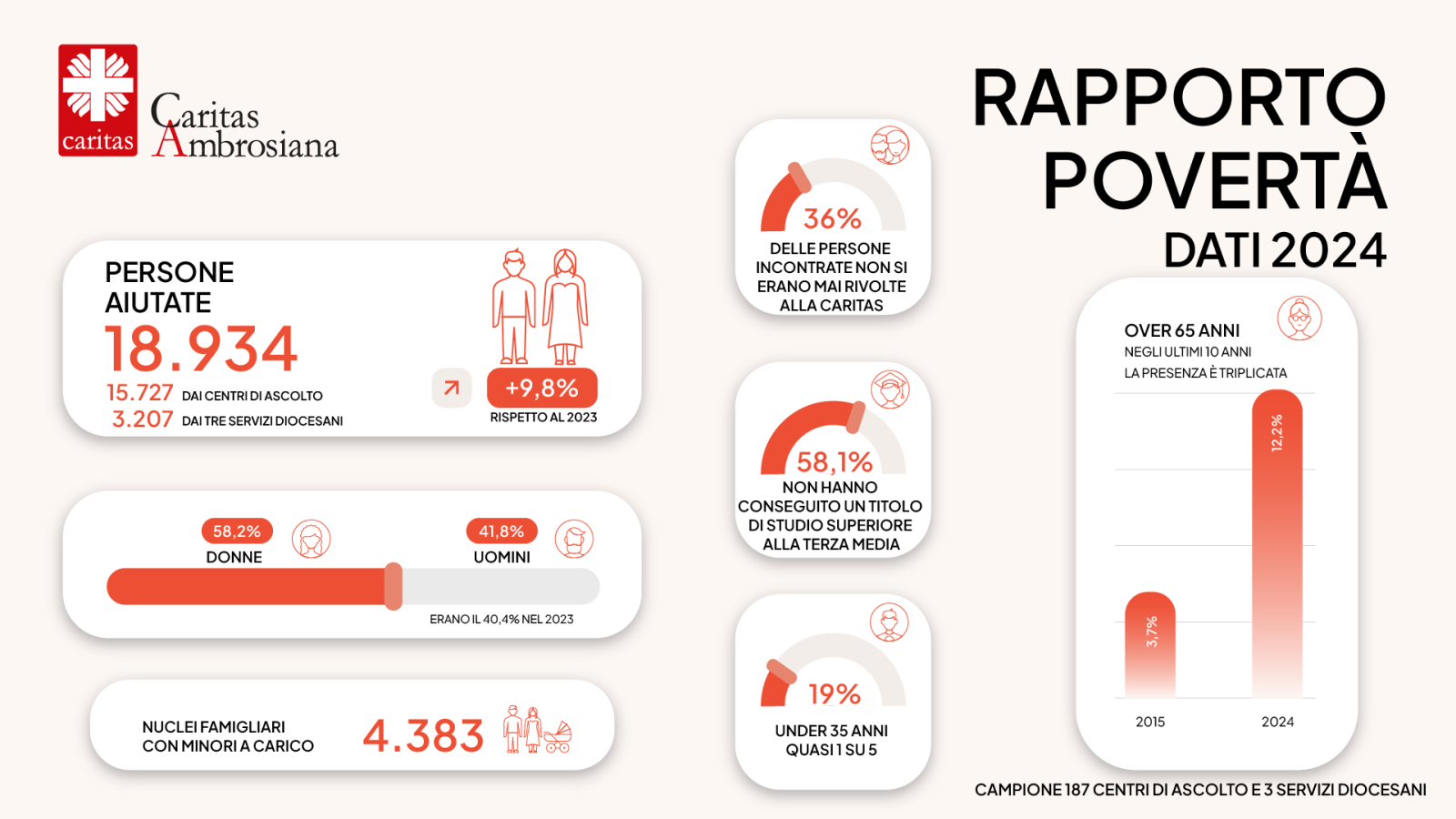 187, rispetto ai 168 del 2023, sui 407 operanti nella diocesi di Milano), che condividono metodo e strumenti di rilevazione. L’aumento dei centri monitorati determina