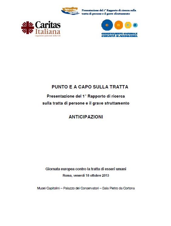 In occasione della Giornata europea contro la tratta di persone (18 ottobre 2013), la Caritas Italiana e il Coordinamento Nazionale delle Comunità di Accoglienza (CNCA), in collaborazione con il Gruppo Abele e l’Associazione On the Road, hanno presentato i risultati della ricerca Punto e a capo sulla tratta. 1° Rapporto sulla tratta e il grave sfruttamento. La ricerca risponde, tra le altre, anche alle domande sopra enunciate a partire da un punto di vista specifico: quello delle operatrici e degli operatori che, attraverso le unità di strada, i centri d’ascolto, gli sportelli, le strutture di accoglienza, i servizi di inclusione socio-lavorativa sono quotidianamente a contatto con vittime di tratta potenziali, presunte o già identificate e assistite.