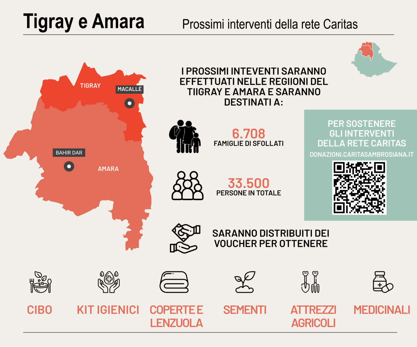 6.708 famiglie di sfollati, ovvero circa 33.500 persone nel Tigray e in Amhara. Si garantiranno loro
