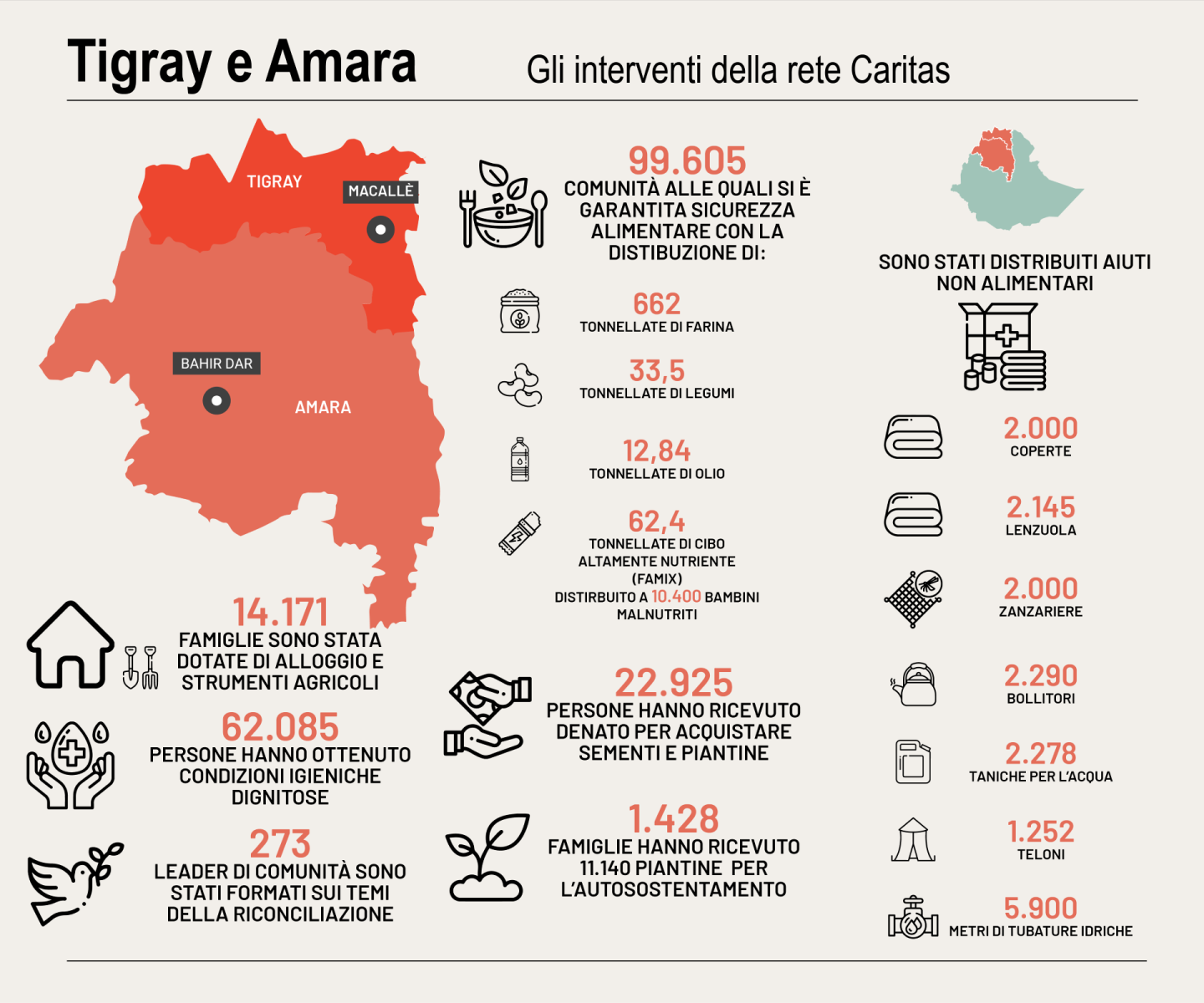 La rete Caritas negli scorsi anni ha garantito la sicurezza alimentare di famiglie vulnerabili, rifugiati, sfollati interni e rimpatriati in 99.605 comunità, ha assicurato condizioni igieniche dignitose a 62.085 persone, ha dotato di alloggio e di strumenti agricoli per provvedere alle necessità di base 14.171 famiglie. Ben 62,4 tonnellate di cibo altamente nutriente sono state distribuite a 10.400 bambini malnutriti sotto i 5 anni, mentre 4.585 famiglie (22.925 persone) hanno ricevuto contanti per l'acquisto di sementi e piantine.