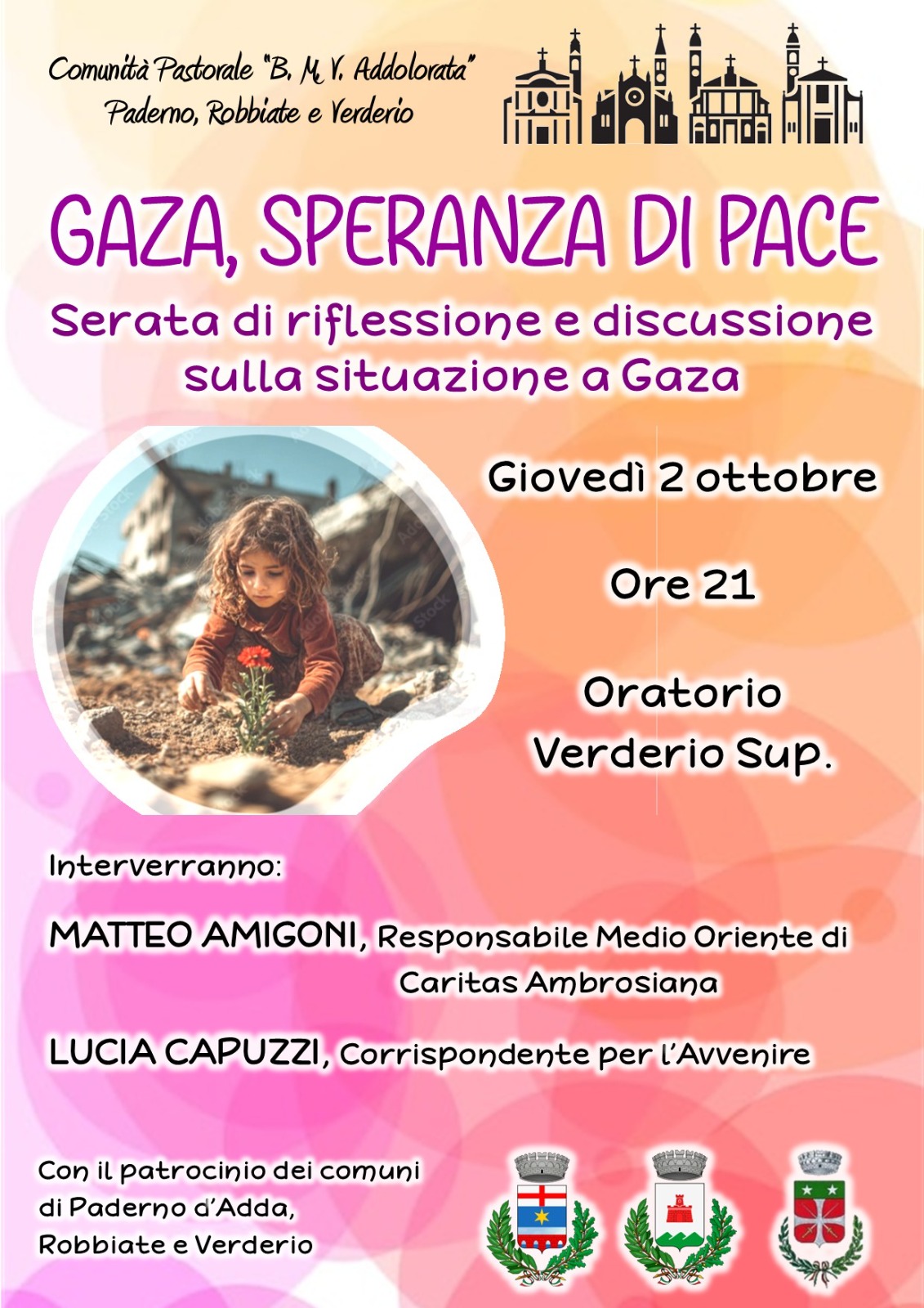 L’incontro è stato organizzato dalla Comunità Pastorale “Beata Maria Vergine Addolorata” di Paderno, Robbiate e Verderio con il patrocinio dei comuni di Paderno D'Adda, Robbiate e Verderio. Durante la serata si darà un aggiornamento sulla situazione a Gaza e in Cisgiordania, dando anche un quadro degli interventi della rete Caritas per questa emergenza.